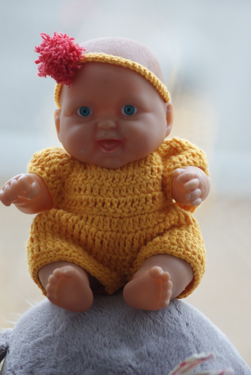 завтра уезжаем на месяц, а доча вцепилась в этого пупса. он был не одетый и я была против(есть куча одетых кукол)но дочь была непреклонна. пришлось срочно решать проблему. ну не поедет же ляля голой. последняя вязалка перед отдыхом. да и я что то больше вышиваю теперь