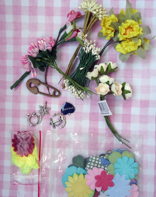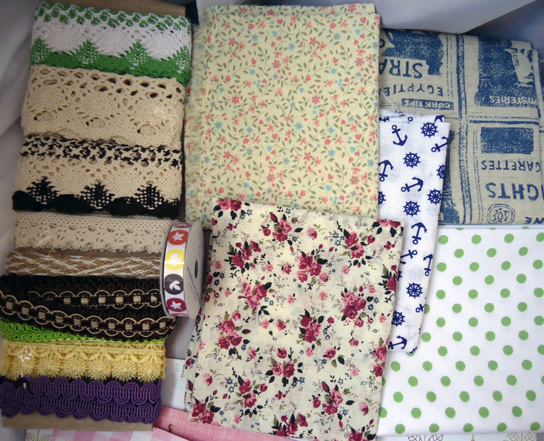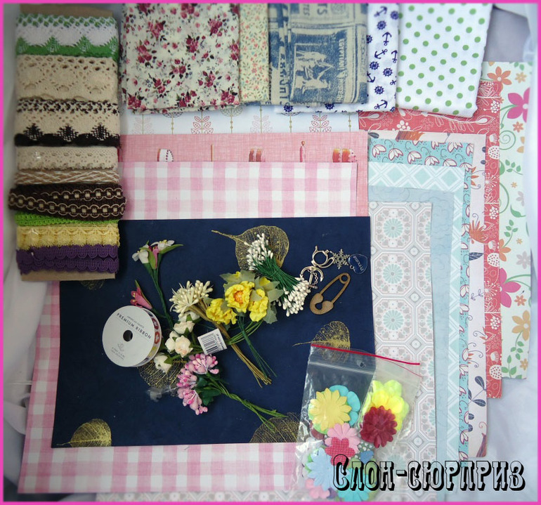 вот все вместе..классная ткань для блокнотов,особенно с розочками и синяя покорили... объемные цветочки,веточки,тычинки, куча бумаги 30х30 см, Абалденные хлопковые кружева, подвески ,ленточки(одна в рулоне-креповая), в общем, всё супер. ща пост выложу и бегом раскладывать по хомячьим запасам....
