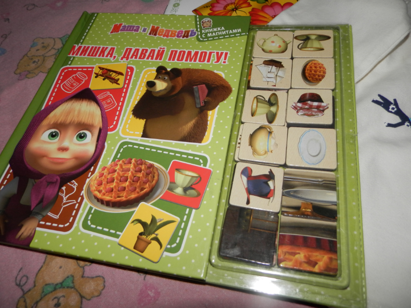 Подарочки для дочи: очень нежная кофточка (она её сегодня таскала целый день и мне птичек показывала )))), замечательная раскраска и та-дам!!! - книжечка с магнитами про нашу любимую Машу!!!!!