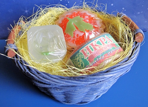 Мыло и косметика своими рукамиНабор "а-ля рус". Банка с икрой - отдушка Ветивер, тарталетка с икрой - отдушка Красная смородина, рюмка водки - отдушка Ананас и мята.