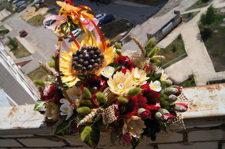 Такая "домашняя", "народная" корзинка. Я больна маками, поэтому им больше всего комплиментов. Так и кажется, что виноград сейчас повалит корзинку, но подсолнух ее крепко держит :))) Не страшно было на периле фотографировать? :)))