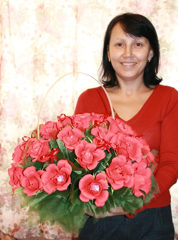 Ирина, розы сами очень удались! А поправить форму букета можно и сейчас. Если каждый цветочек на зубочистке затейпировать вместе со шпажкой. Ну и фунтиков наделать для объема ;) Тогда корзинка станет - загляденье!!! Правда, если поднимать композицию, то надо еще цветов наделать, такого количества уже не хватит.