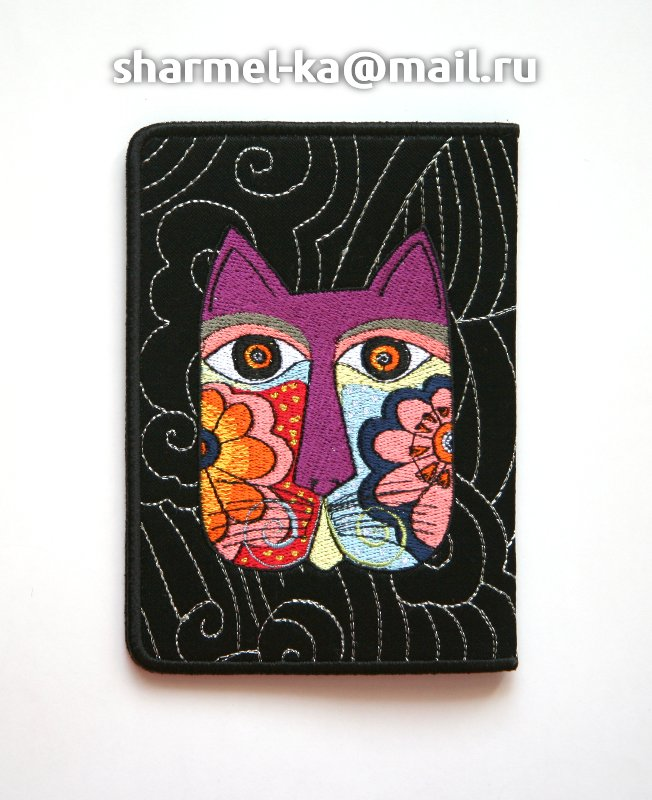 Вышитая обложка для паспорта с серебряной стежкой "сашико" и фантастическими котами по мотивам картин известной художницы Лаурель Бурч (Laurel Burch) - отличный подарок для любителей котэ (есть еще варианты кошачьих лиц