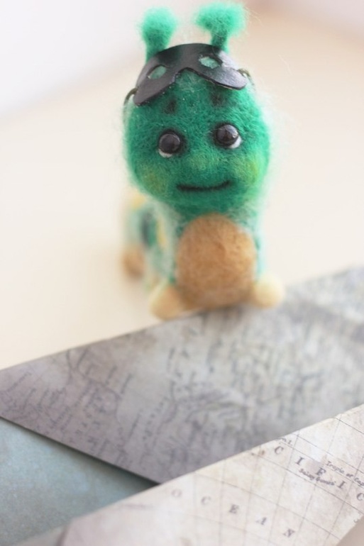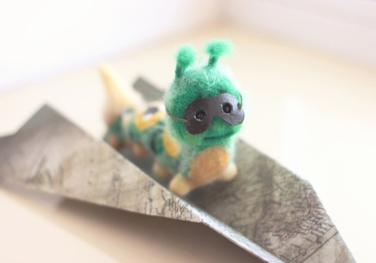 Выполнен в технике сухого валяния, на проволочном каркасе. У гусеницы яркий узор на спинке и мягкий пушок) есть очки для полетов и самолетик из карты