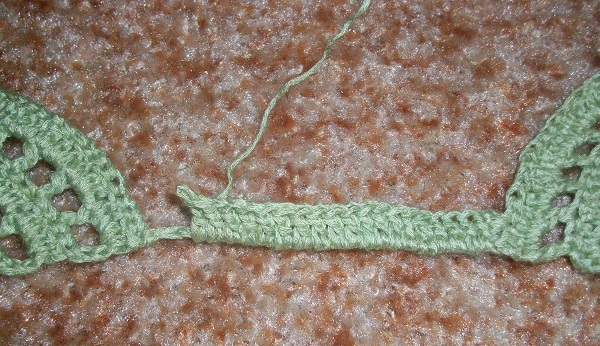 В конце - набирала цепочку из воздушный петель (на длину завязки) и продолжала обвязку банданы по низу - 3 ряда столбиков с накидом: