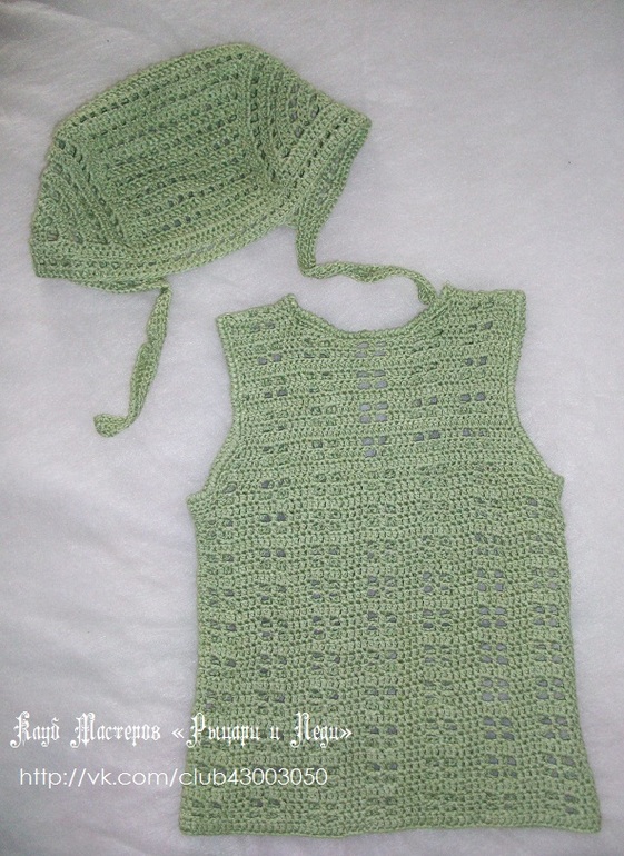 Вязать начинала снизу вверх - набирала цепочку из воздушных петель (количество на глаз, но так чтобы было кратно рисунку и соответствовало обхвату животика), вязала по кругу до пройм, затем вязала спинку и полочки, прикладывая к покупной маечке сына для правильного вывязывания пройм и горловины. Швы получились только на плечах, затем обвязала всё одним рядом столбиков без накида и одним рядом рачьего шага.