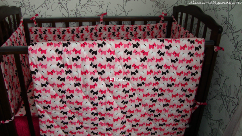 Пошился заказик одеялко стеганое, простынь,наволочка, пододеяльник и стеганые бортики. Передний бортик снят для демонстрации.