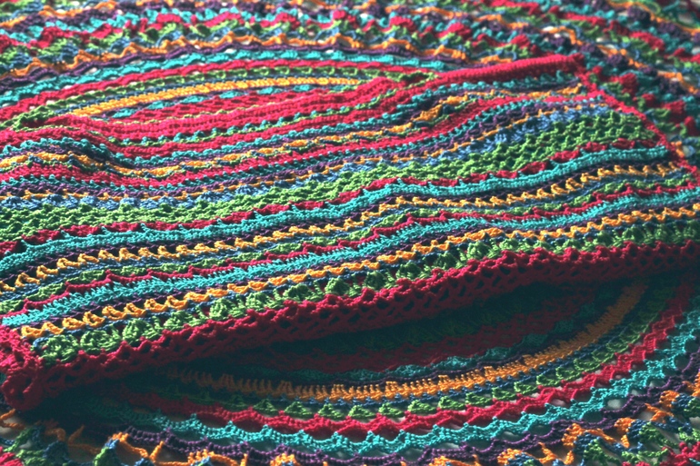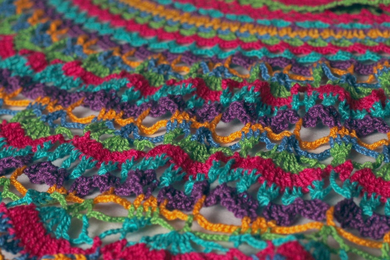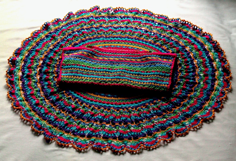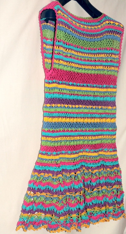 Платье вязалось в комплект к купальнику, отсюда такое буйство красок. Использовала пряжу "Пехорка Ажурная", "Пехорка Успешная" и по мотку "Виолета" и "Лили", крючок №2 и 2,5.