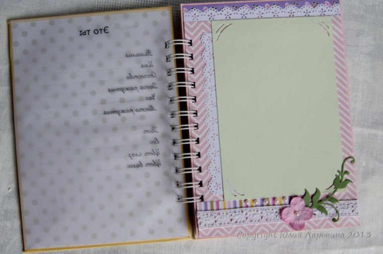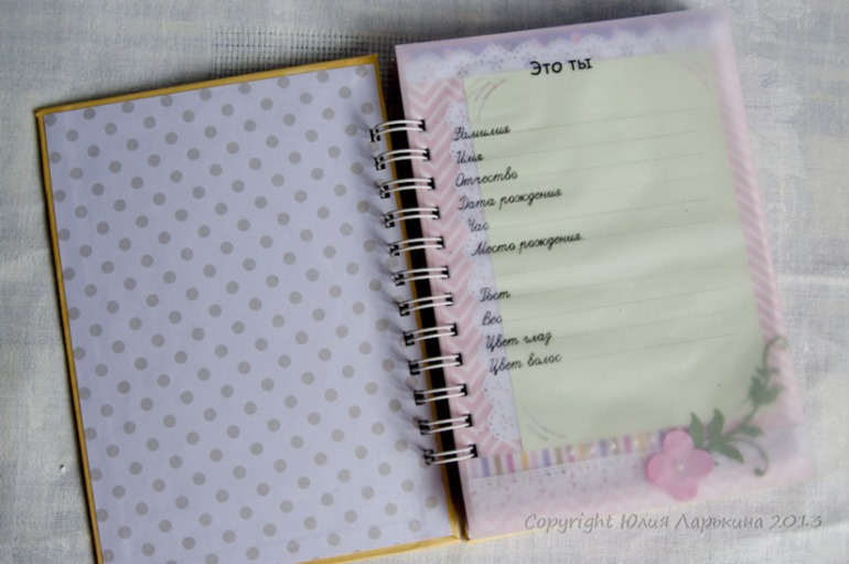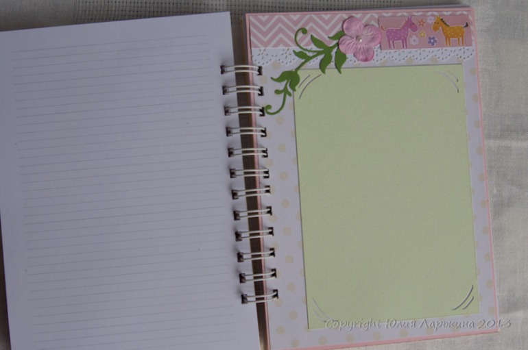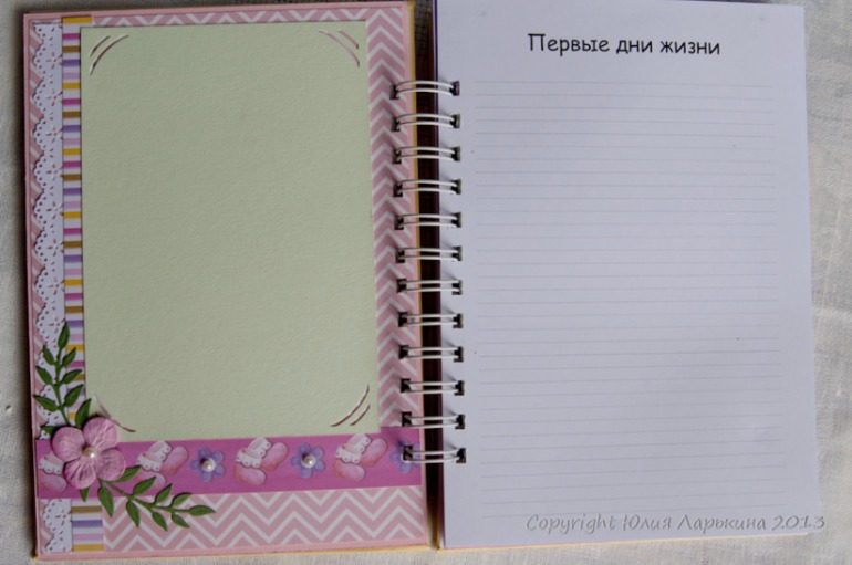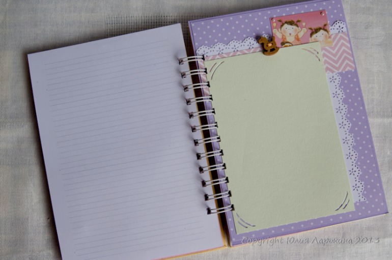 СкрапбукингМне очень нравиться делать детские альбомы, но иногда большие и вместительные альбомы сильно утомляют и отнимаю много сил, поэтому у меня возникла идея, а почему не сделать блокнот для важных заметок и добавить в него несколько страничек для фото, и вот что у меня вышло