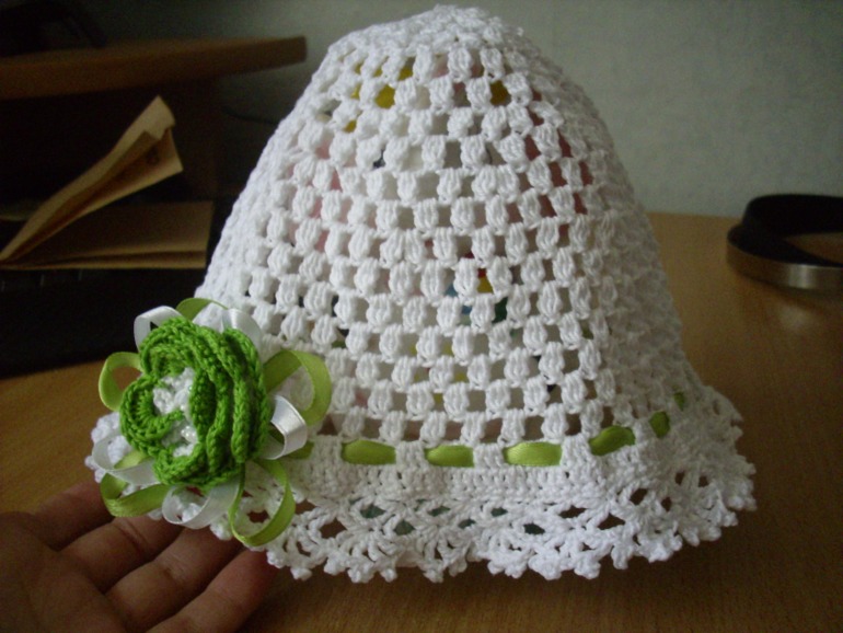 так нежно, сочный зеленый цветочек очень украшает чудесную шапулю, и ещё обвязка очень интересная! Нету случайно схемки?)