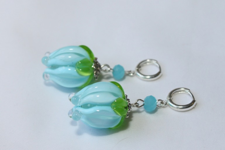 6. Серьги "Голубые бутоны" Авторский лэмпворк, "цирконы", швензы посеребреные