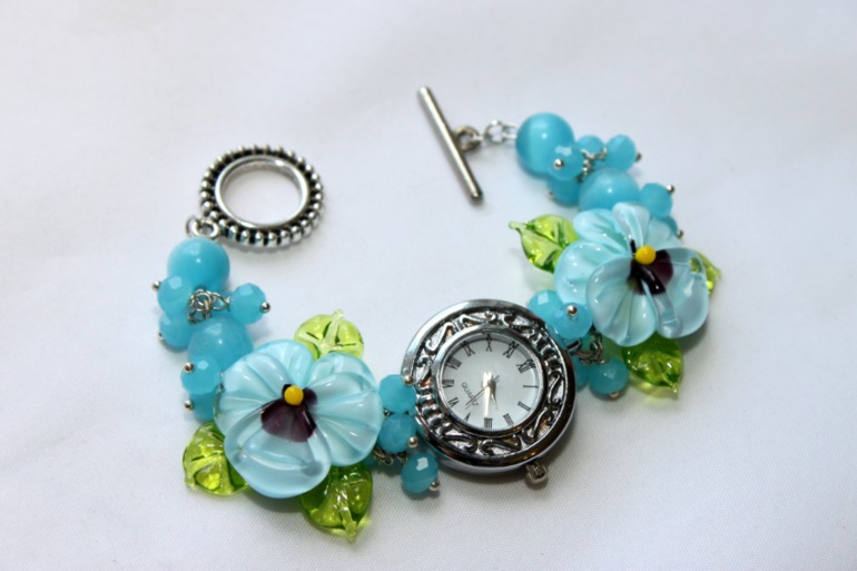 5. Часы "Анютины глазки" Фурнитура под серебро, кошачий глаз, "цирконы", авторский лэмпворк