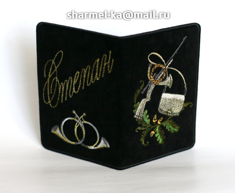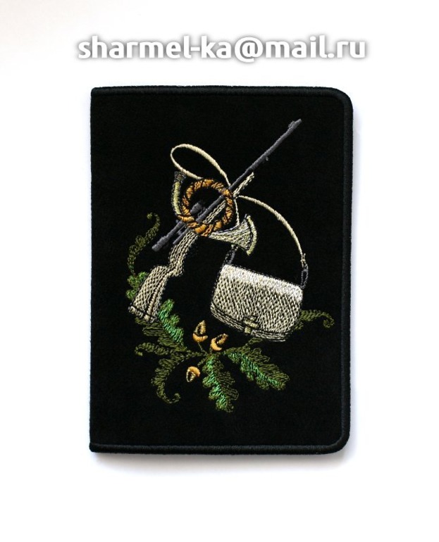 Эффектная вышитая обложка для паспорта с охотничьими атрибутами - идеальный подарок настоящему охотнику. Могу вышить имя или инициалы владельца (как пожелаете :)).