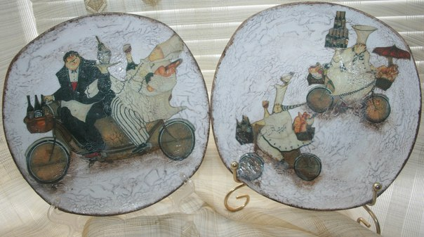 ДекупажЗаказ был опять на тарелки с поварятами. Двушаговый кракелюр и всё такое... Как обычно достаю баночки Маймери и шок- второй шаг как гель, причем очень густой гель, почти твердый. Что делать?.. Нанесла первый шаг, второй пальцами размазывала соответственно как могла, толстым слоем, как масло на бутерброд ложилось. В итоге,ууффф, трещинки появились, причем какие, напомнили Креал. Заказ отдан, заказчица как всегда рада. Проходит пару недель, собираю все на дачу и что я вижу, у меня три баночки Маймери, я давай проверять номера и понимаю, что вместо 754 на 753 я нанесла стекловидный лак!)))) Совсем стара стала. Но сделала вывод для себя, что выкидывать такие вещи, даже если они в состоянии желе, совсем не обязательно и, что стекловидный лак, прекрасный второй шаг для кракелюрной пары, только несмываемый)))