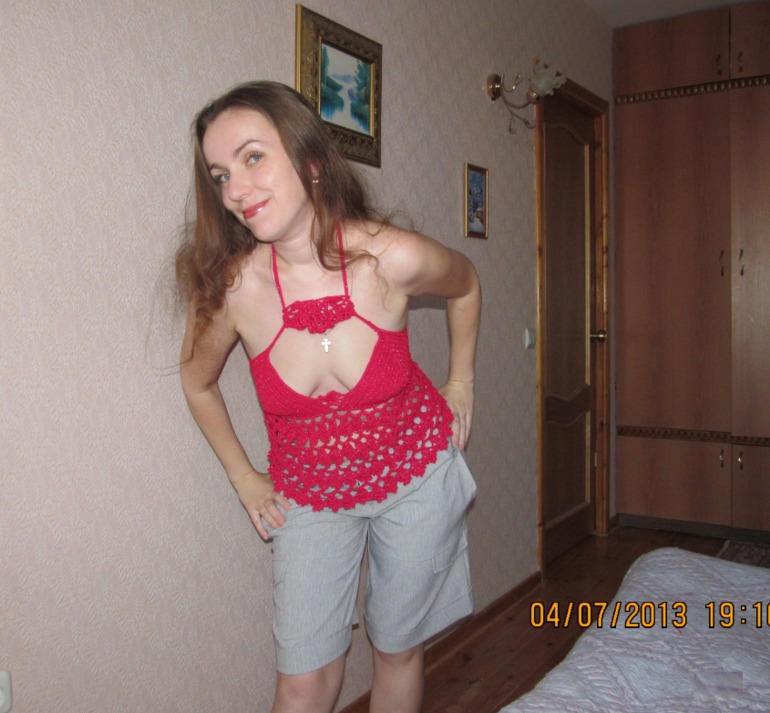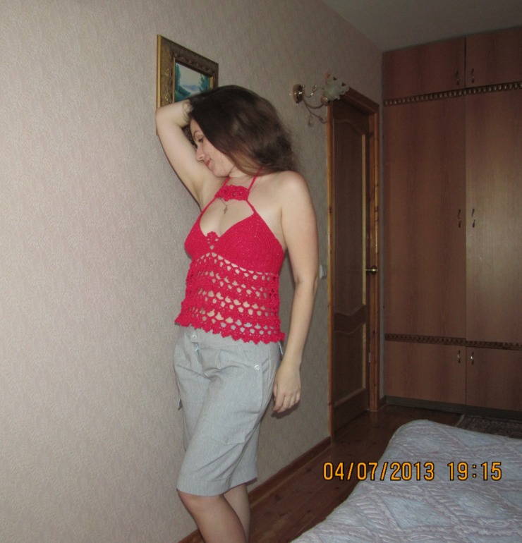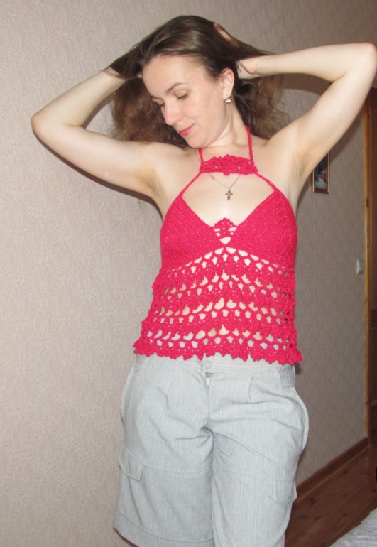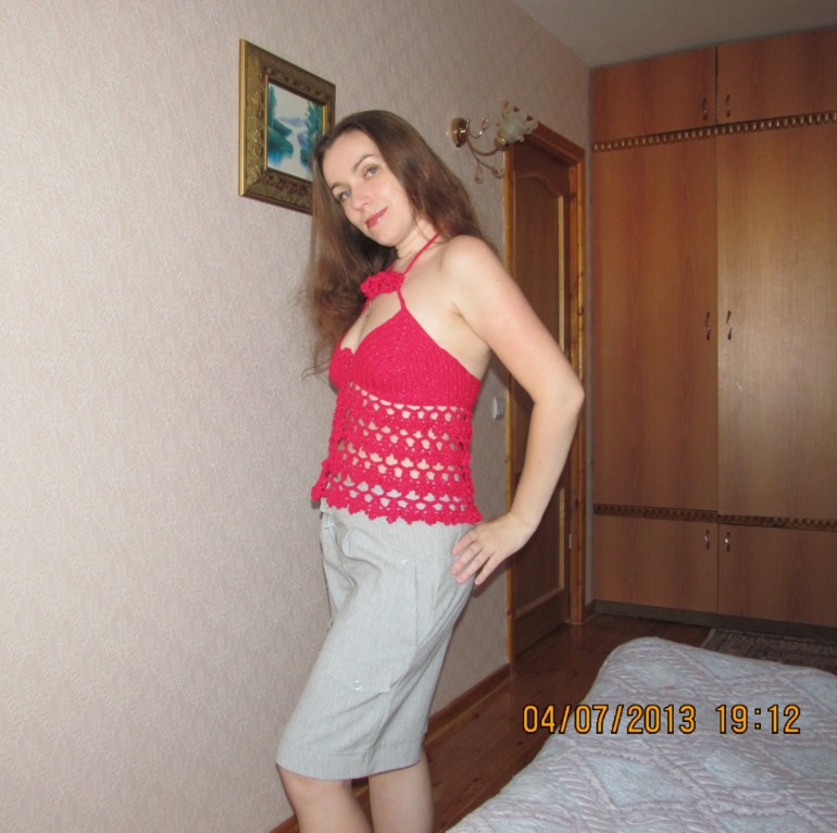 Этот топ дорог мне еще и тем, что сынок помогал мне его вязать - обычно он не любил когда я вяжу, а тут или сидел рядом, смотрел как завороженный, или спокойно играл рядом, или клубочек держал и ниточку разматывал. Вот, вместе с ним, можно сказать, и сотворили. Правда, муж смотрит как-то недоверчиво и говорит что не выпустит меня в таком виде на улицу, но мы это уладим...