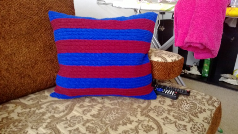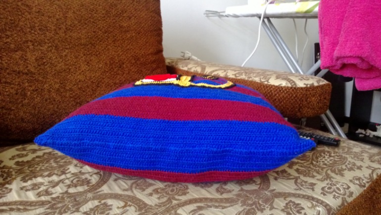 Для мужа, который болеет за этот испанский клуб связала диванную подушку. Нитки: Подушка - шерсть "Magic"(вязала в 2 нитки, крючок №3).Эмблема - 100% хлопок "Coco", крючок №2, шерсть "Magic".