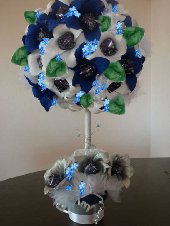 Ирина, Смелое решение: первенец - и сразу дерево)). В любом случае, уверена, что свит-дизайн Вас увлек)) Так что, добро пожаловать в наше сообщество!!!По композиции: идея сине - белого дерева удачна. Красивое, благородное сочетание. Можно добавить зелени, это не испортит идею. но освежит деревце, сделает его более реалистичным. По поводу пространства: цветочки стоят слишком близко друг к другу, закрывая и перекрывая друг-друга. Из-за этого ломается визуально их форма, не понятно, что это за цветочки: розы, ромашки. лилии? Ирина, не бойтесь пространства! И пробелы между цветами должны быть обязательно, это воздух для глаз)) Да и каждый Ваш цветочек заслуживает, чтобы его рассматривали, оценивали, а не воспринимали только цветовой "кашей". Пробелы же легко заполняются той же зеленью(лепестками, фунтиками, мелкоцветами). Последние выполнят и еще одну функцию: совместить в одной композиции детали разных размеров, придать живости, иначе глаза устанут от однотипности.В фотошопе нарисовала, как можно разбавить такое деревце. Это только мое предложение, как бы я его дополнила: