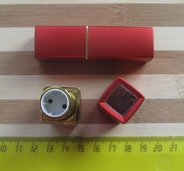 15. Туба для помады. Стандартный размер. Красный футляр с золотой каймой, сверху вставка из прозрачного пластика, через которую виден оттенок помады. 35 руб.