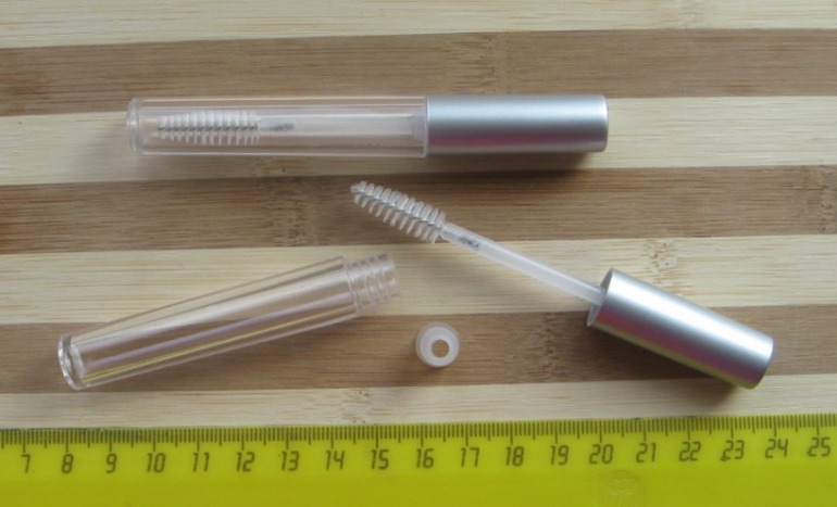 17. Туба под тушь для ресниц. Прозрачный корпус, серебристая крышечка. (Подходит только для туши, не подходит для масла для ресниц и других жидких консистенций). 20 руб.