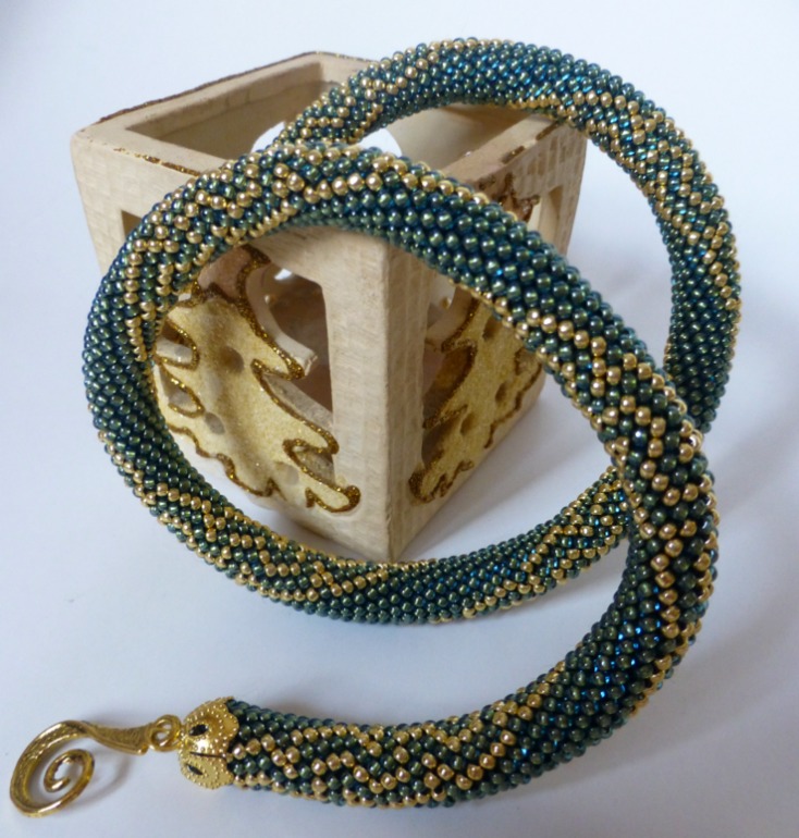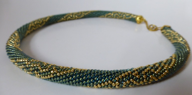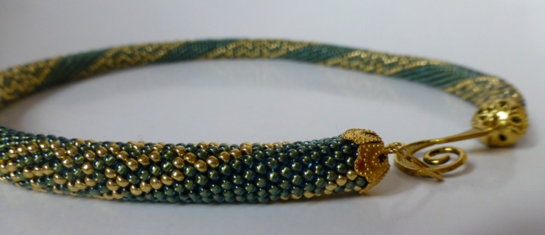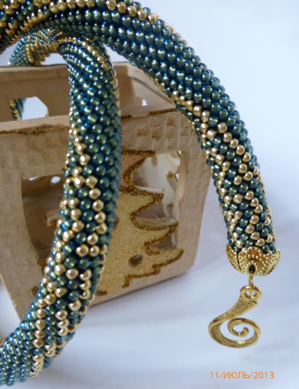 2. 2-х цветный жгут: морская вода (подкрашенная изнутри золотом) и золото, фурнитура под золото. В зависимости от освещения бисер меняет цвет.