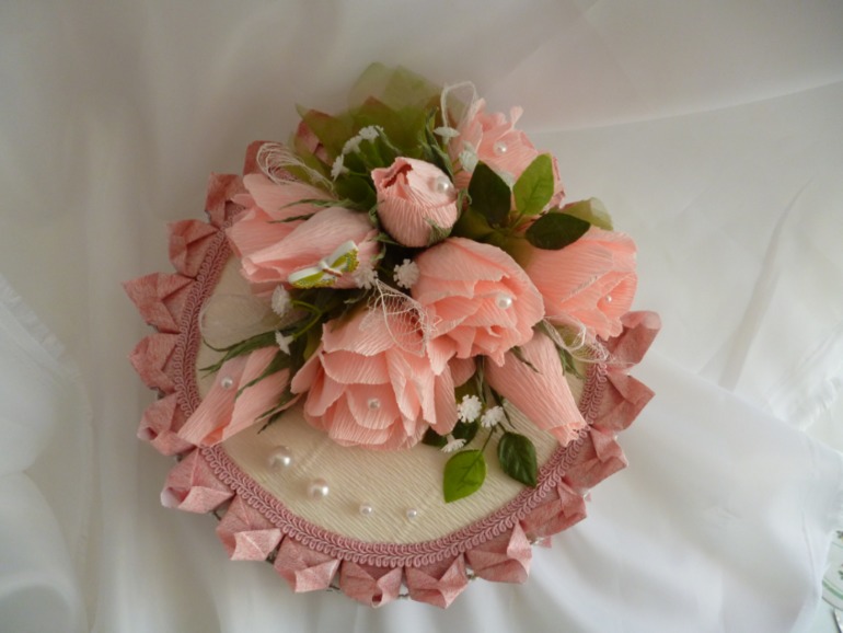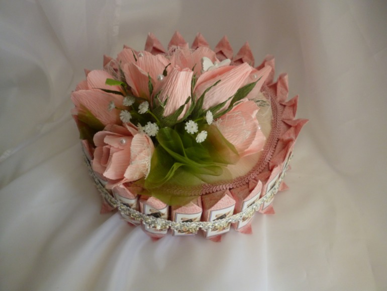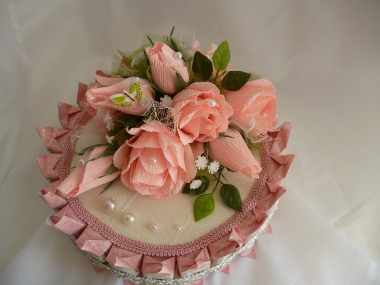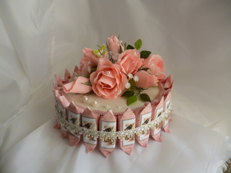 Изготовила тортик(мало опыта было в этом),но процесс меня зацепил,делала на одном дыхании,к маме в гости собираемся с мелким,у неё др был,собираю по-потихоньку подарочки,вот из своего рукоделия решила подарить что-нибудь,букет я ей дарила ,решила торт испечь. Меня смущает ленточка на конфетах,думаю,может купить пошире розовую в цвет роз и тонкую белую?