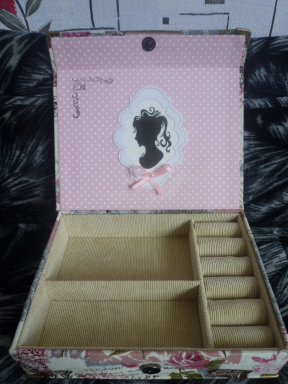 Внутренний отдел обтянут бежевым вельветом, имеется 3 отделения, в т.ч. для колец и сережек-гвоздиков.