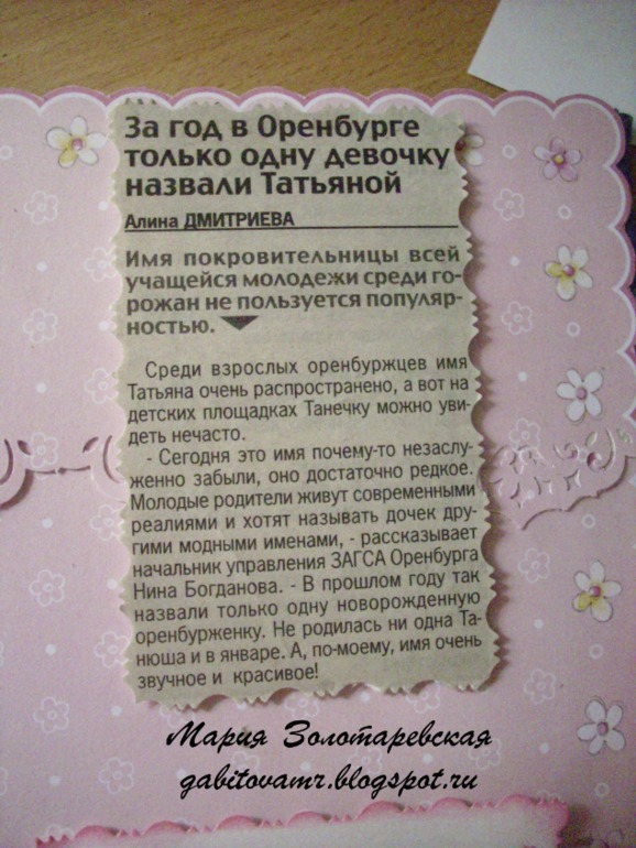 Действительно, заметно, что альбом сделан с любовью! Было интересно помотреть. Не осталась не замечанной вырезаная заметка из газеты. Никогда бы не подумала, что имя "Татьяна" уже стало таким редким. А дочке-то какая память :)