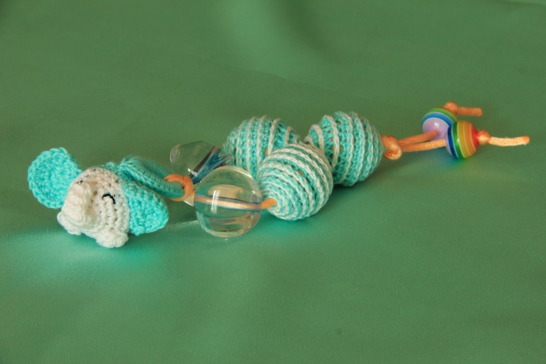 Здравствуйте! Бусины лучше деревянные некрашеные, диаметром не меньше 2-3 см. Или можно акриловые. Хорошо получается из ириса, он не пушится, когда деть грызет. Еще Coco и прочий мерсеризированный хлопок. .также есть колечки для обвязывания, деревянные и пластиковые, шнур прочный не помешает. Коробочки от киндеров - могут греметь, и из них можно сделать сову, например.Правильно, самой вязать их лучше всего!Моей нравится с рельефными бусинами грызть, они такие ребристые!