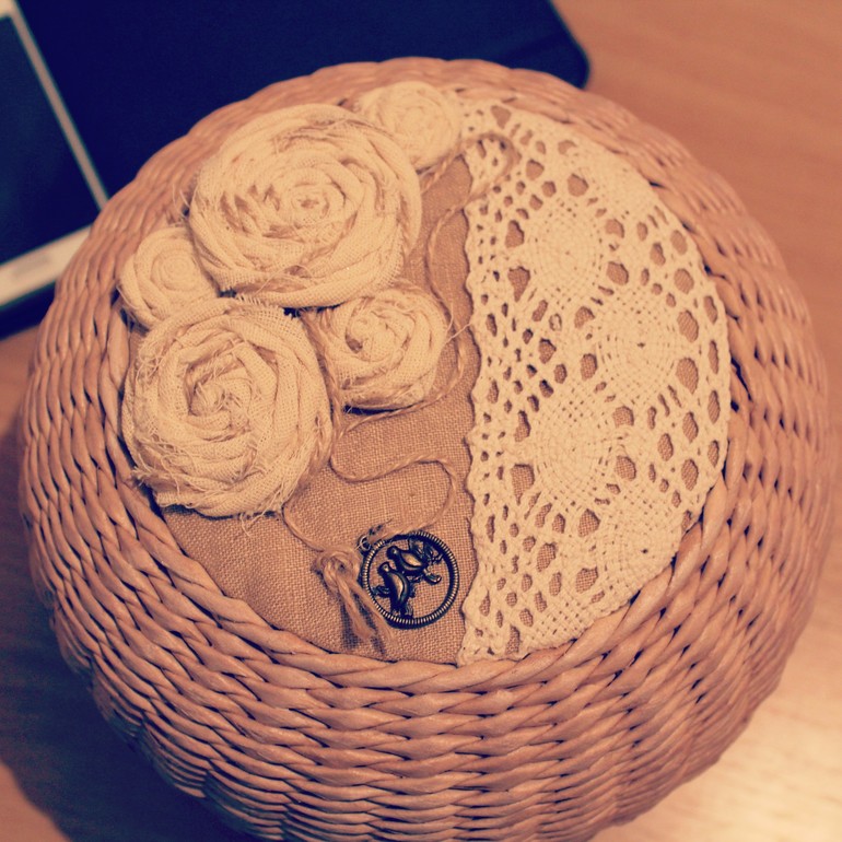 из материалов ушло: 6г супер-клея и моток джутовой веревки из обычного хозяйственного магазина за 50р (еще и осталось)..укладывала веревку по кругу и сразу же приклеивала, на всю работу ушло часа три полного времени, особо никуда не торопясь