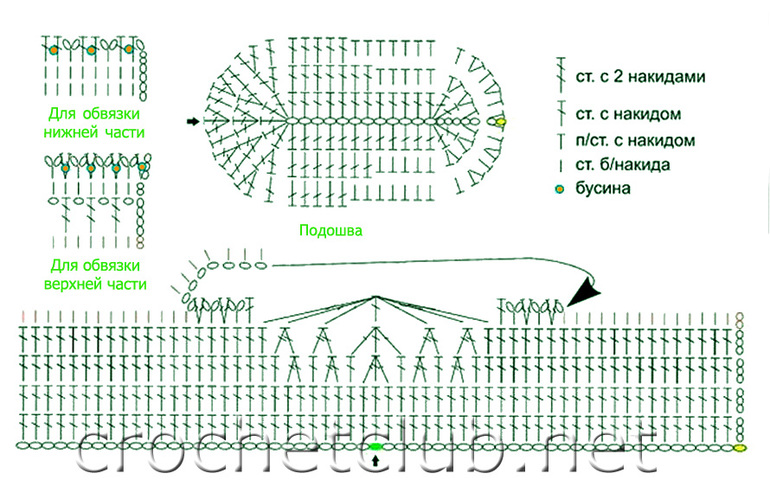 Сначала вяжешь подошву,потом 2 ряда без прибавок-убавок по кругу,намечаешь середину носка и делаешь убавление по нижней схеме.Самый последний ряд туфелек будет там где нужно вместе провязать 6 ст с накидом.