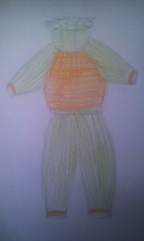 Можно пришить туда такую же БОЛЬШУЮ бабочку, сделав её из цветных кусочков ткани. Но лияно я бы распорола любую старую и убитую куртку практически лубого цвета, просто приложила бы комбез и выкроила из неё всю часть спинки и пришила. И из этой же ткани обработала окантовкой край рукава и штанишек, от покупной тогданикто никогда не отличит)) Рисовать я не умею, но получилось бы примерно вот так: