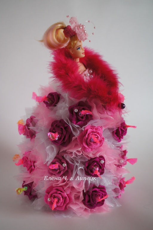 Люблю я такие розульки, и хоть натуральности им не хватает, они на нее и не претендую. Как фантазийный цветок очень даже веселенькие. Обе корзинки понравились, гамму по настроению и ту и другую можно выбрать, мне вот сейчас больше последняя нра)) А что ты конфетку не вложила в серединку, с конфеткой тоже можно только с маленькой, карамелькой например. Вот я куколку делала, цветики такие же, только маленькие (большие то на платье не подойдут) в серединку карамельки миники вставляла. А то вроде бы букет из конфет, а конфет и нету))