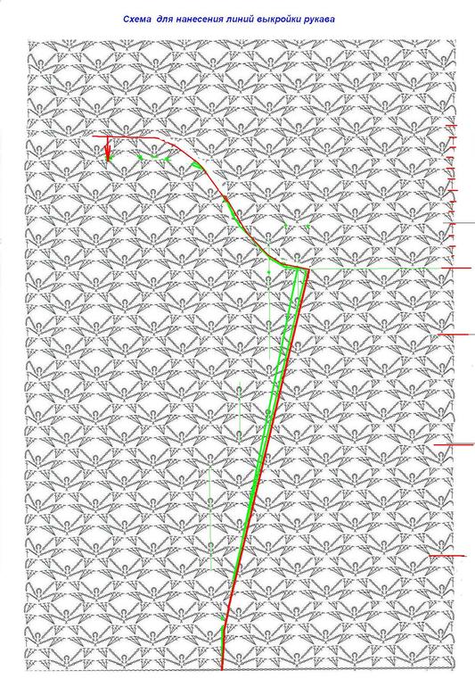 я тебе советую вымерять по связанному полотну эти 5 см и высоту проймы и просто нарисовать или распечатать схемку и прям на ней прорисовать эту лини скоса плавную. а потом уже по этой линии подравнивать схему. надеюсь понятно написала?типа как здесь