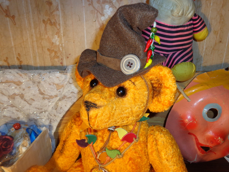 Мишка сшит по старинной выкройке 1920г.Материал: настоящий винтажный плюш 1980 г(да-да,запасы моего хомяка недавно пополнились замечательным СССРовским плюшем))).Шляпа из фетра,со старинной пуговицей и перчиками-лемпворк.На шее шнурок с металлической подвеской и листиками из кожи.