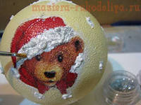 Складочки вы имеете в виду на мордочке немного? Покройте несколькими слоями лака с просушкой каждого и можно с помощью красок на мордочке добавить светло желтого и замаскировать складочку. А так очень хорошо получилось! Шар достаточно сложная поверхность для наклеивания мотива!