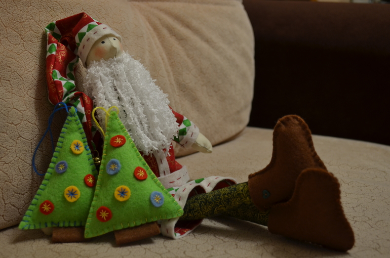 опаздываю с выполнением задания! Пришло вдохновение, сшила за пару дней Санту к Новому году) И елочки, конечно, в придачу))