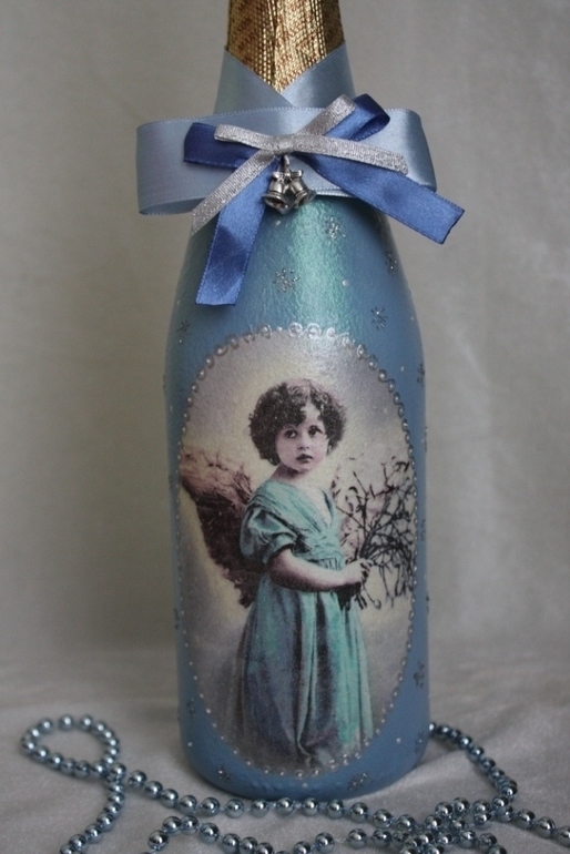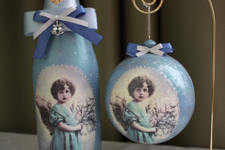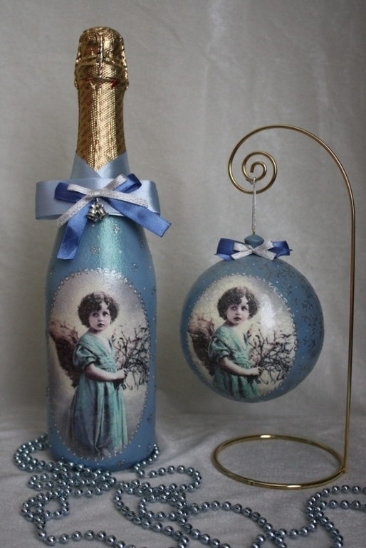 ДекупажРабота делалась для конкурса, но немного не срослось, поэтому прошу ..... Новогодний комплект "Винтажный ангел", включает в себя елочный шар и бутылку шампанского, пока не нашел свой уютный дом)))