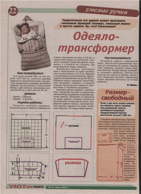 Я рожала в конце февраля и шила конверт-трансформер с прорезью на молнии (типа пододеяльника). Сделала изначально небольшой слой утеплителя, а на март добавляла сколько нужно, в апреле вынула. Вот такой я шила