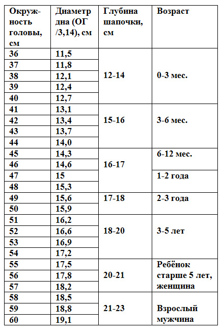 Вот табличка Вам в помощь!!!А ещё высоту (глубину)шапочки можно определить так:Высота шапки=Окружность головы : 3 + 3 см