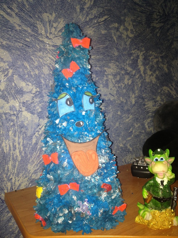 Эта елочка сделана из сизаля стоит на коробке конфет и внутри елки тоже конфетки