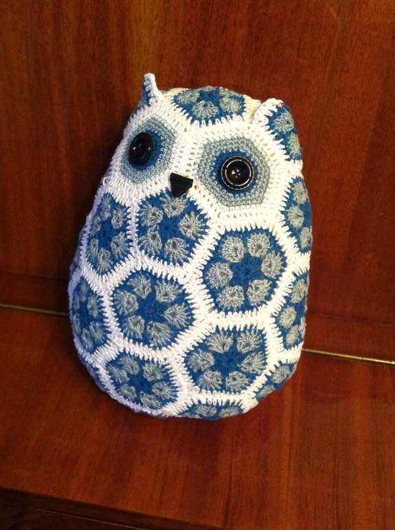 Такая милая совушка! Надо тоже за такую взяться)Кстати, думала сейчас из каких ниток связать и поняла, что из подходящих белые и синие)))А нет.... еще желтые есть.