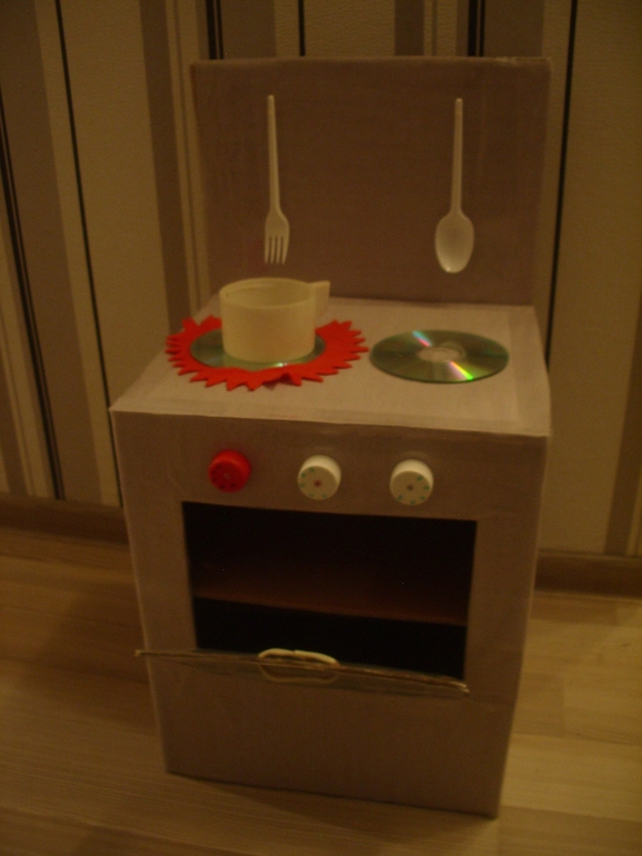 Лежала у меня коробка от швейной коробки и решила из нее смастерить кухонку для своих малышей. Ушло на все пару часов времени и немного материала- то что нашла дома. Вот результат.
