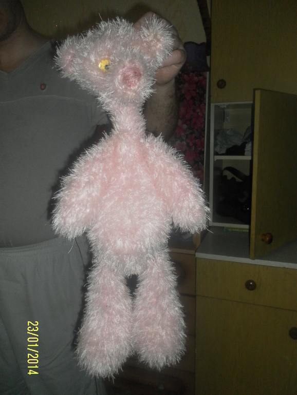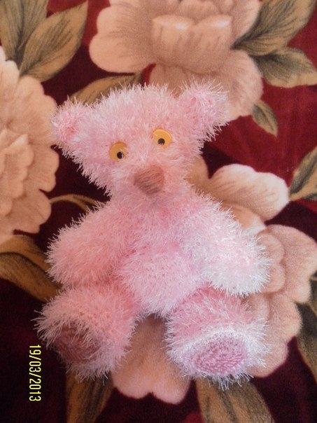 Симпатичный мишка)) да,жалко,что растянулся(( наверное и правда крючок меньше надо,но согласна,что мелким неудобно вязать..Следующую буду вязать поэксперементирую с добавлением пряжи простой