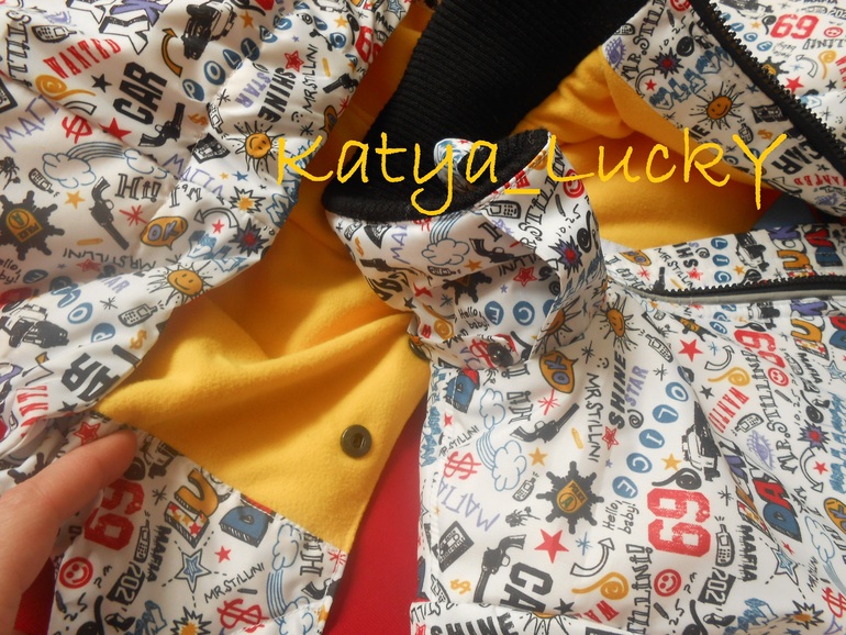 КУРТКА: верх - принтованная матовая дюспа, подклад - яркое желтое термополотно, утеплитель - альполюкс100+изософт 40 с основной части, альполюкс 100 в рукавах, светоотражающие канты, трикотажный подвяз.