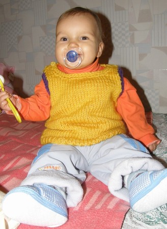 Теперь зайчонке не страшен холод и ветер, ведь мама связала ей вот такую ОЧЕНЬ теплую жилеточку. Не пугайтесь дикой расцветки ))) Вязала из остатков желтой пряжи и не хватило именно на обвязку пройм. Так что уж вот такая кислотная вещица получилась ))) Мы ее уже опробовали на прогулке. Видите, какая Варена довольная? Не замерзла! )))