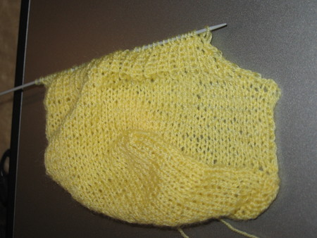 3. Затем набираю с правого края 20 петель с кромочных и этой же спицей (на которую набрала кромочные) провязываю 22 оставшиеся петли "затылка":