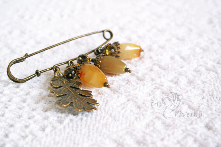 Дубовый лист: фурнитура под бронзу, агат, стеклянные бусины.