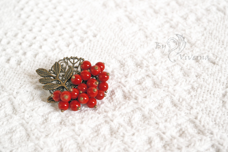 Рябинка: бусинки тонированный коралл, фурнитура под бронзу. Маленькая изящная брошечка. Уже куплена.