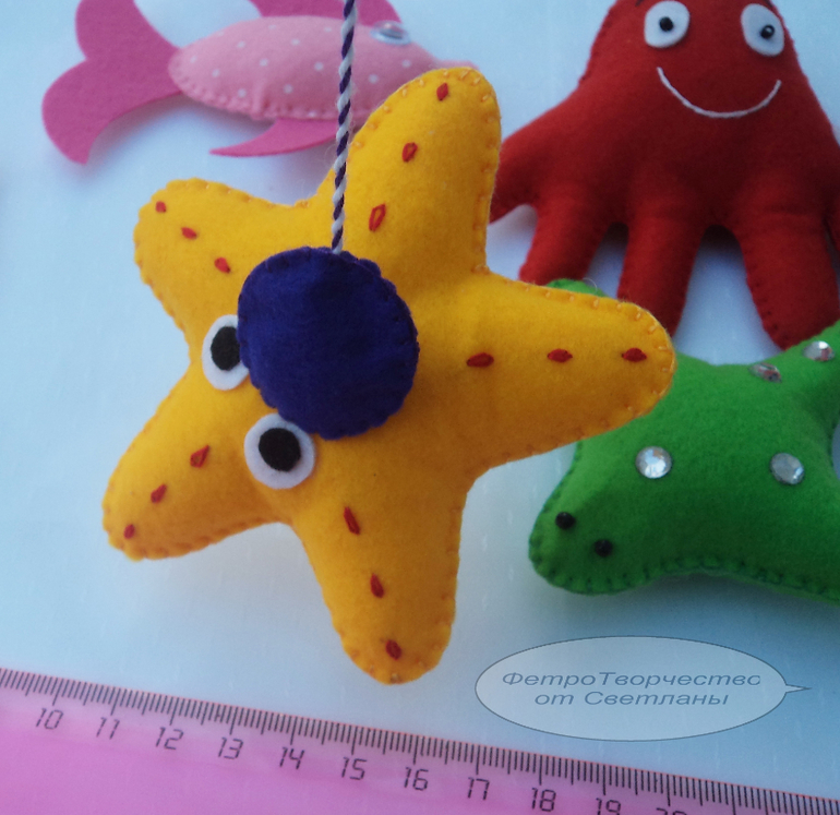 Морские обитатели выполнены из фетра,наполнены синтетическими шариками и внутри каждого вклеен неодимовый магнит ( никаких скрепок , так эстетичнее и безопаснее). "Крючок" у удочки - неодимовое кольцо обшитое фетром.
