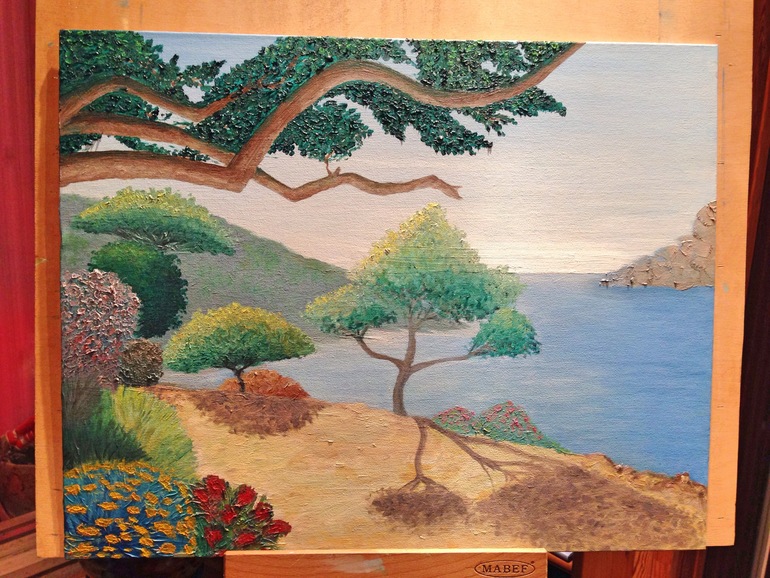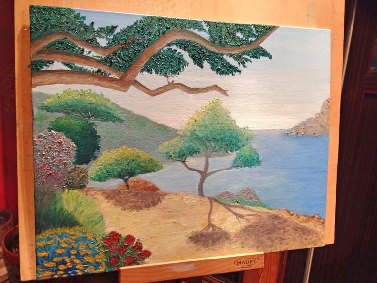 такое ощущение,что жалеете краску..вот дерево по центру ..нижняя часть море просвечивает..наложили бы большим слоем и с просветами,то смотрелось бы объемно)ну и еще серая гора немного смущает)
